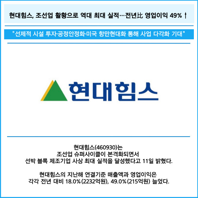 [카드] 현대힘스, 조선업 활황으로 역대 최대 실적…전년比 영업이익 49%↑