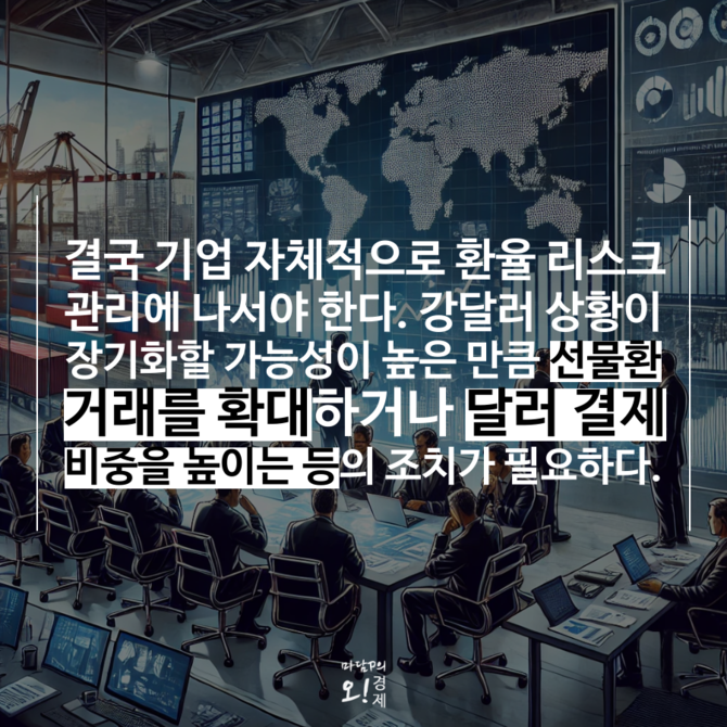 한편 관세 부담이 수익성 악화로 직결되면서 환율 리스크에 대한 개별 기업들의 대응도 중요해졌다. 글로벌 금융시장의 불확실성이 커진 상황에서 강달러 기조가 장기화될 가능성이 높아 수출 기업들은 선물환 거래 확대, 달러 결제 비중 증가 등의 환율 리스크 관리 전략을 마련해야 한다.