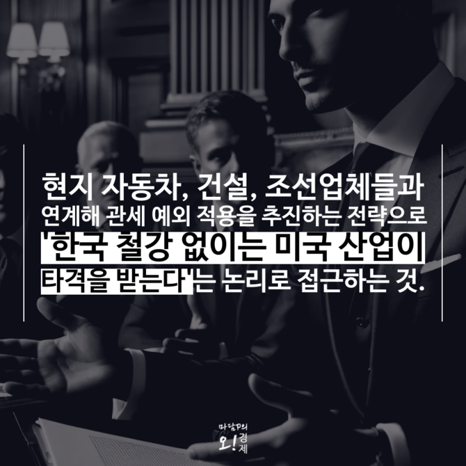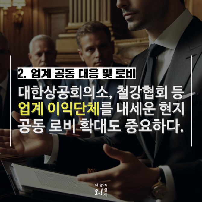 물론 개별 기업 차원의 대응만으로는 한계가 있다. 업계 차원의 공동 대응과 로비를 위해 대한상공회의소, 철강협회 등 국내 주요 경제 단체들이 미국 내 무역협회와 수입업체들과 협력해 관세 예외 적용을 추진해야 한다는 목소리도 나온다.