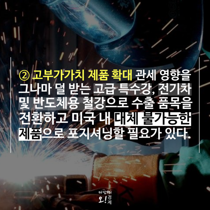 그나마 관세 부담이 적은 고부가가치 제품군으로 수출 전략을 전환하는 것도 중요하다. 특히 전기차·반도체·항공산업 등에서 필수적인 고강도 특수강, 친환경 소재 등 미국 자체 생산이 어려운 분야의 비중을 확대하는 방식이 필요하다.