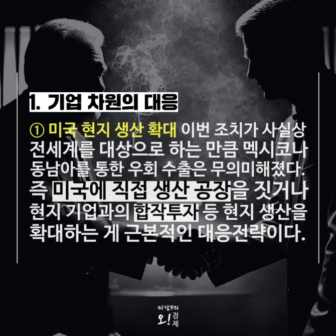 먼저 이번 조치가 사실상 전세계를 타깃으로 한 만큼 멕시코·동남아 등을 통한 우회 수출은 사실상 불가능해질 가능성이 크다. 결국 미국 내 직접 생산 공장을 신설하거나, 현지 기업과 합작투자 등을 통해 생산 비중을 늘리는 방식이 유력한 대안으로 떠오르고 있다.