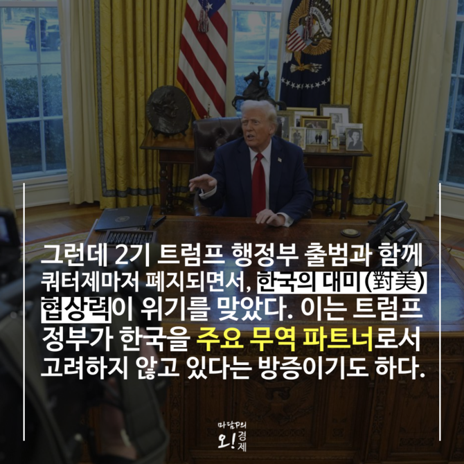 우리나라는 2018년 1기 트럼프 행정부 시절 무역확장법 232조 적용을 피하기 위해 기존 수출물량의 70% 상당인 연간 263만 톤에 한해 수출량을 제한하는 '쿼터제'를 유지하며 관세를 면제 받아왔다. 하지만 트럼프 2기 행정부가 출범하면서 쿼터제마저 폐지되고 전면 관세 부과가 확정되면서 한국의 대미(對美) 협상력이 약화됐다는 평가가 나오고 있다.