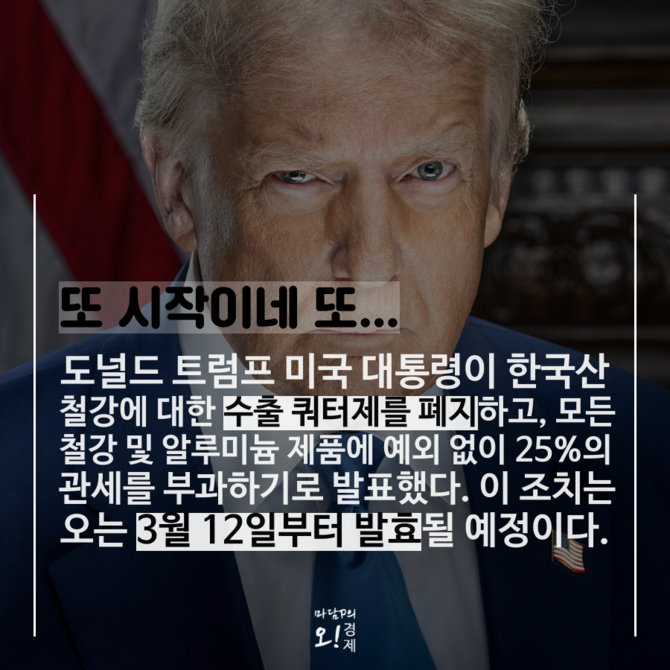 [프라임경제] 도널드 트럼프 미국 대통령이 한국산 철강에 대한 수출 쿼터제를 폐지하고, 모든 철강 및 알루미늄 제품에 25%의 관세를 부과하는 행정 명령에 서명했다. 이 조치는 오는 3월 12일 부터 공식 발효될 예정이다.