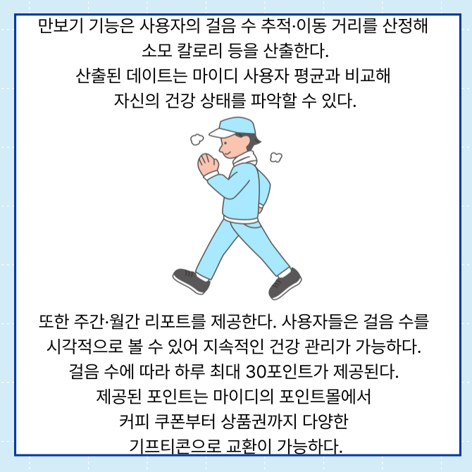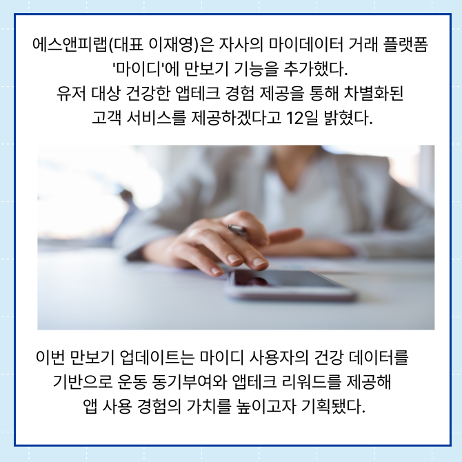 [프라임경제] 에스앤피랩(대표 이재영)은 자사의 마이데이터 거래 플랫폼 '마이디'에 만보기 기능을 추가했다. 유저 대상 건강한 앱테크 경험 제공을 통해 차별화된 고객 서비스를 제공하겠다고 12일 밝혔다.