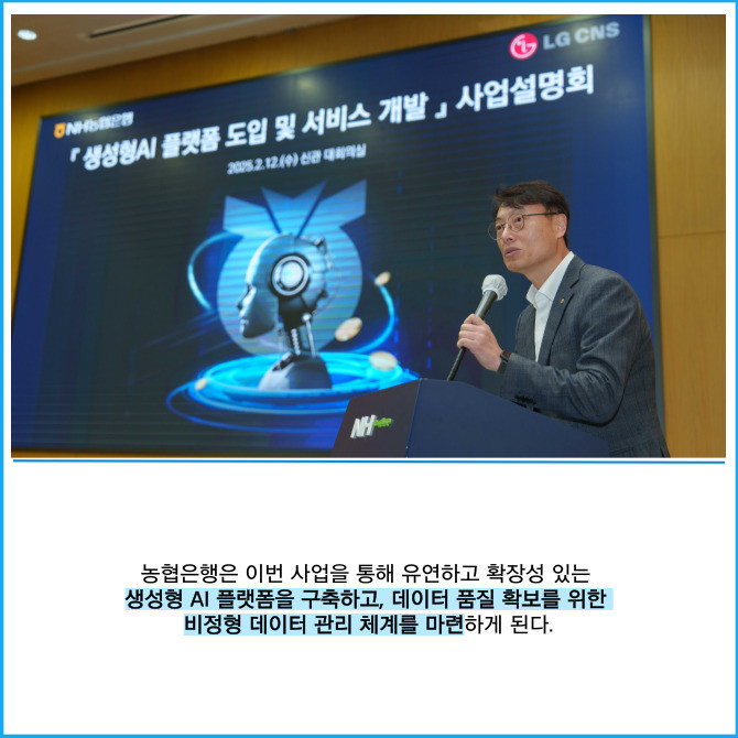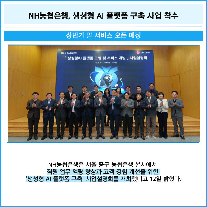 [프라임경제] NH농협은행은 서울 중구 농협은행 본사에서 직원 업무 역량 향상과 고객 경험 개선을 위한 '생성형 AI 플랫폼 구축' 사업설명회를 개최했다고 12일 밝혔다.