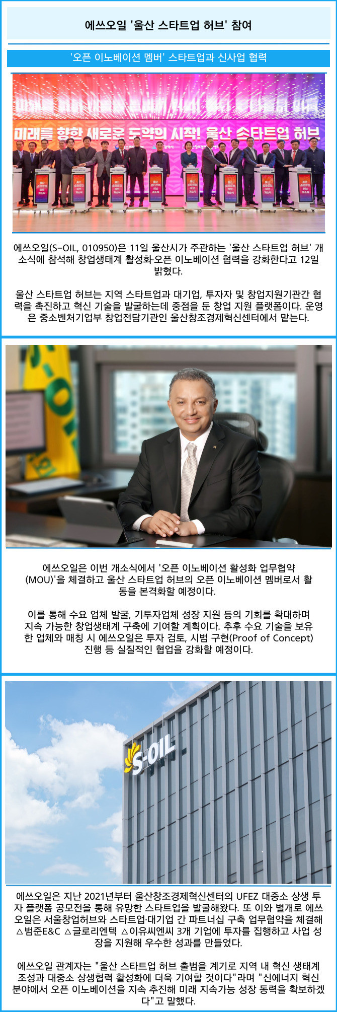 [프라임경제] 에쓰오일(S-OIL, 010950)은 11일 울산시가 주관하는 '울산 스타트업 허브' 개소식에 참석해 창업생태계 활성화·오픈 이노베이션 협력을 강화한다고 12일 밝혔다.