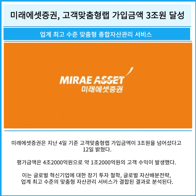 [카드] 미래에셋증권, 고객맞춤형랩 가입금액 3조원 달성