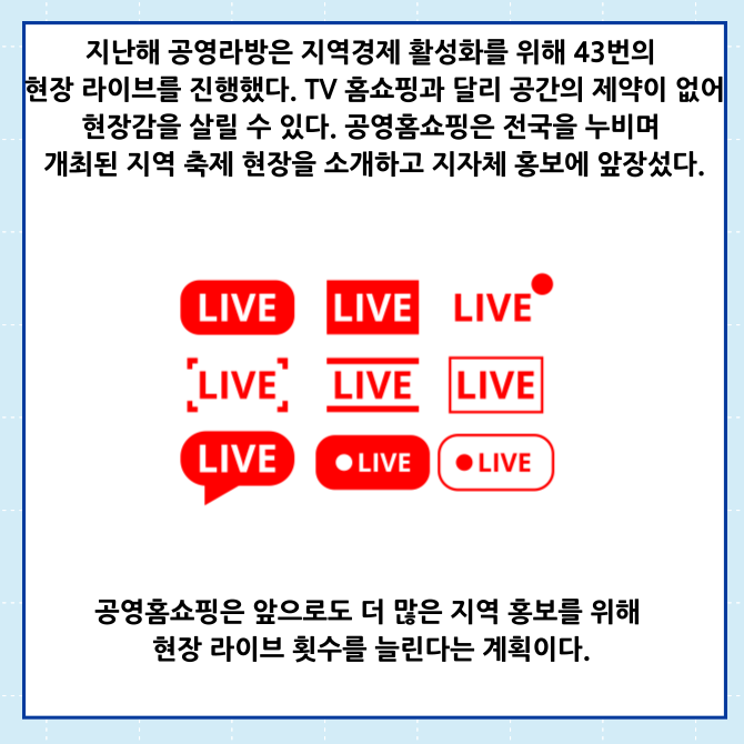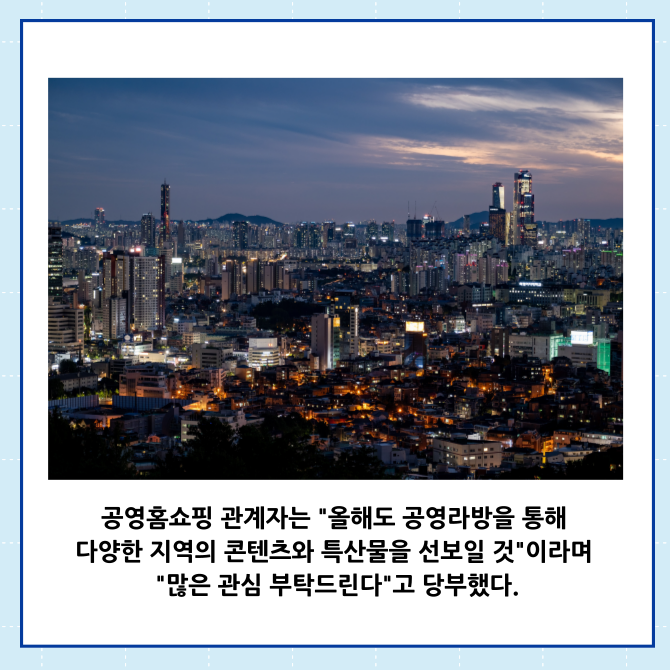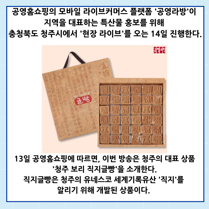 [프라임경제] 공영홈쇼핑의 모바일 라이브커머스 플랫폼 '공영라방'이 지역을 대표하는 특산물 홍보를 위해 충청북도 청주시에서 '현장 라이브'를 오는 14일 진행한다.