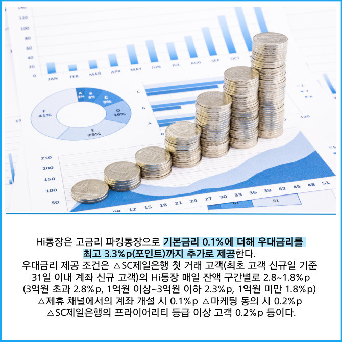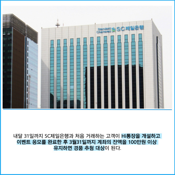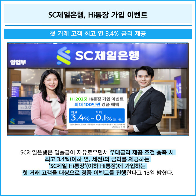 [프라임경제] SC제일은행은 입출금이 자유로우면서 우대금리 제공 조건 충족 시 최고 3.4%(이하 연, 세전)의 금리를 제공하는 'SC제일 Hi통장'(이하 Hi통장)에 가입하는 첫 거래 고객을 대상으로 경품 이벤트를 진행한다고 13일 밝혔다.
