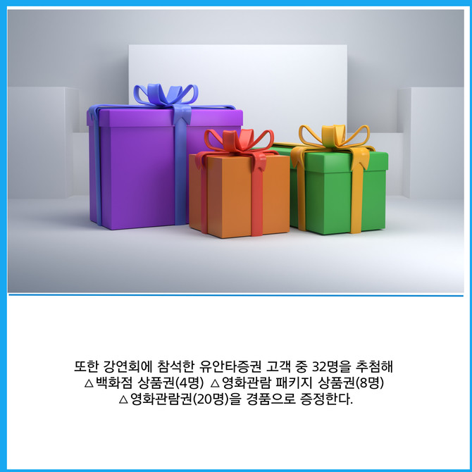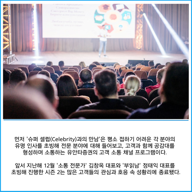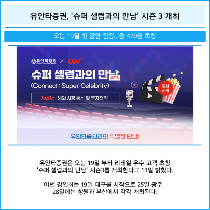 [프라임경제] 유안타증권(003470)은 오는 19일 부터 리테일 우수 고객 초청 '슈퍼 셀럽과의 만남' 시즌 3를 개최한다고 13일 밝혔다. 이번 강연회는 19일 대구를 시작으로 25일 광주, 28일에는 창원과 부산에서 각각 개최된다.