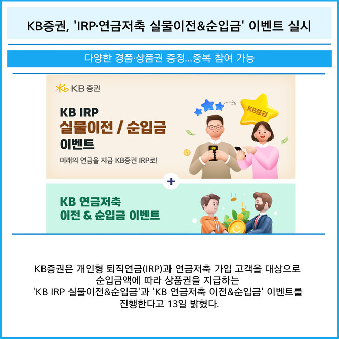 [프라임경제] KB증권은 개인형 퇴직연금(IRP)과 연금저축 가입 고객을 대상으로 순입금액에 따라 상품권을 지급하는 'KB IRP 실물이전&순입금'과 'KB 연금저축 이전&순입금' 이벤트를 진행한다고 13일 밝혔다.
