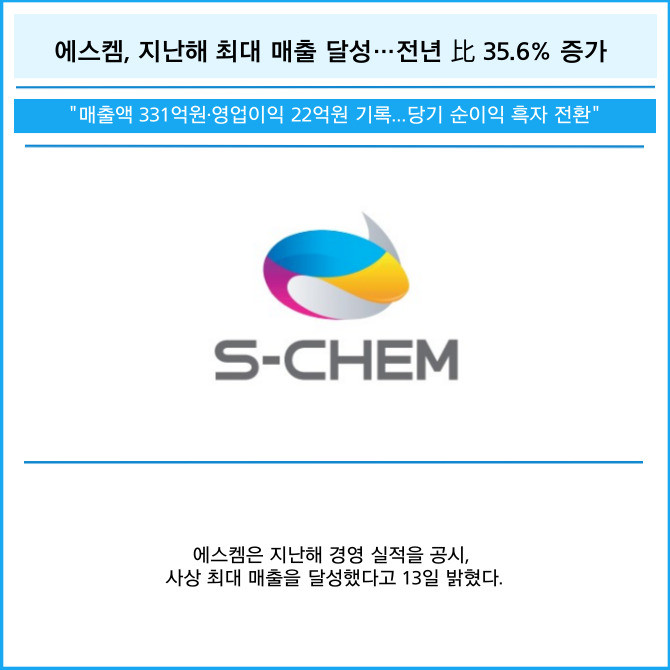 [프라임경제] 에스켐(475660)은 지난해 경영 실적을 공시, 사상 최대 매출을 달성했다고 13일 밝혔다.