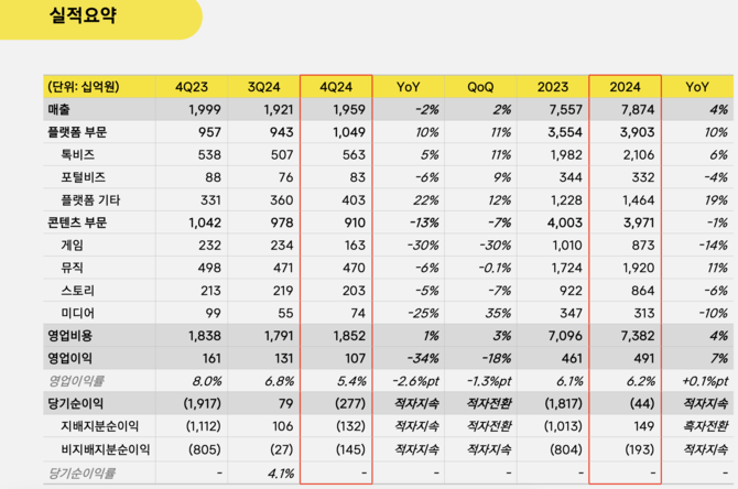 사업 부문별로 보면 지난해 4분기 플랫폼 부문 매출액은 전년 동기 대비 10% 늘어난 1조491억원으로 집계됐다.