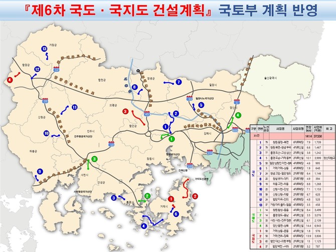 경남도는 도내 주요 간선 도로망 21개 사업(141.4km, 3조7556억원)이 지난달 23일 기획재정부 일괄 예비타당성 조사 대상으로 선정됨에 따라 이를 제6차 국도·국지도 건설계획에 최대한 반영되도록 행정력을 집중한다.