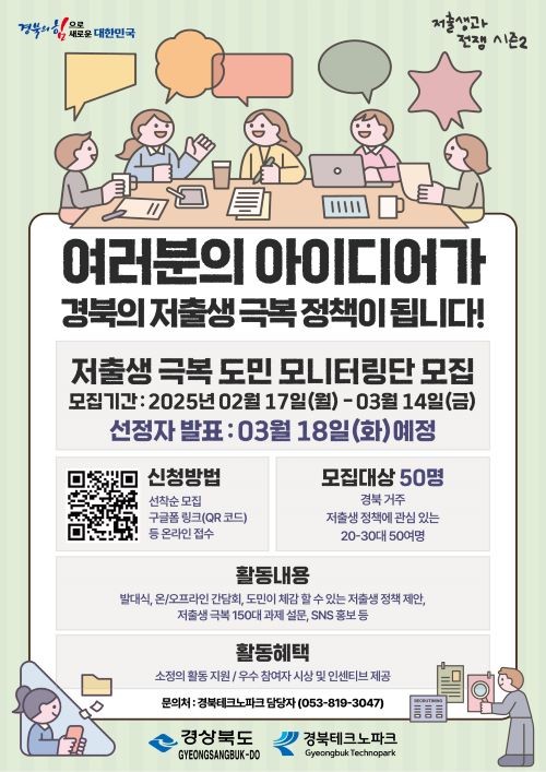 경북테크노파크 관계자는 "저출생 정책을 개선하기 위해 도민 모니터링단 지원에 적극적인 관심과 참여를 부탁드린다"며 "도민과 함께 소통하며 저출생 극복을 위해 지속적으로 노력할 것"이라고 밝혔다.