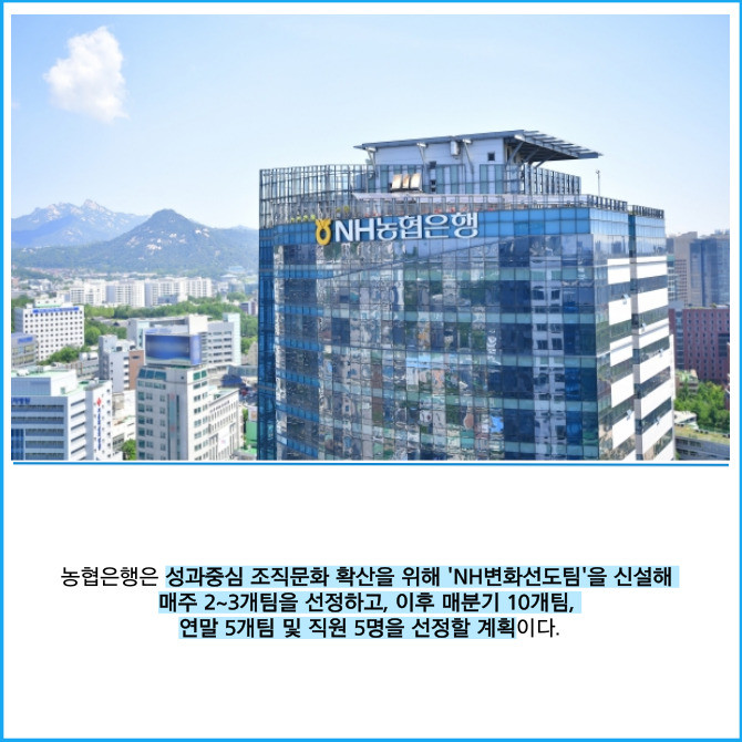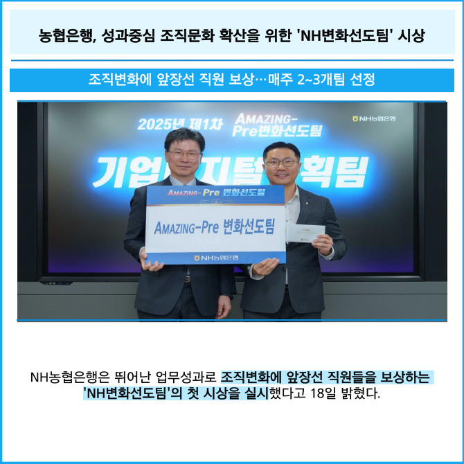 [프라임경제] NH농협은행은 뛰어난 업무성과로 조직변화에 앞장선 직원들을 보상하는 'NH변화선도팀'의 첫 시상을 실시했다고 18일 밝혔다.