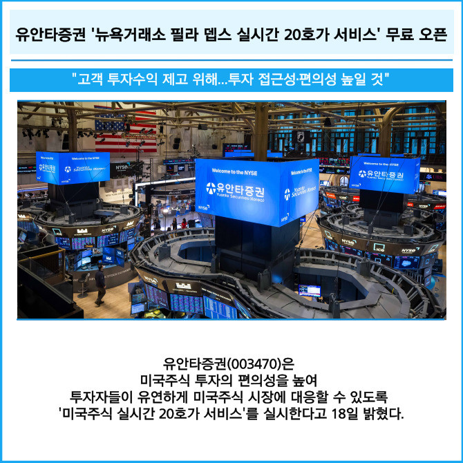 [프라임경제] 유안타증권(003470)은 오늘부터 미국주식 투자의 편의성을 높여 투자자들이 유연하게 미국주식 시장에 대응할 수 있도록 '미국주식 실시간 20호가 서비스'를 실시한다고 18일 밝혔다.