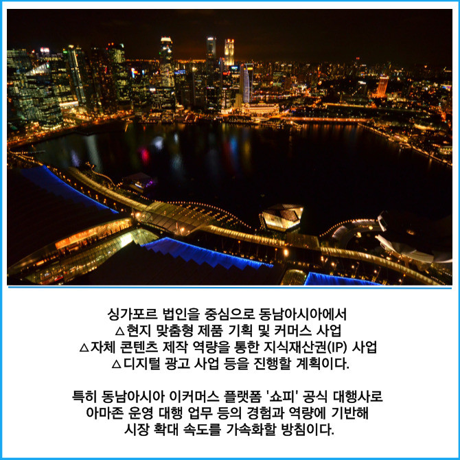 싱가포르 법인을 중심으로 동남아시아에서 △현지 맞춤형 제품 기획 및 커머스 사업 △자체 콘텐츠 제작 역량을 통한 지식재산권(IP) 사업 △디지털 광고 사업 등을 진행할 계획이다.