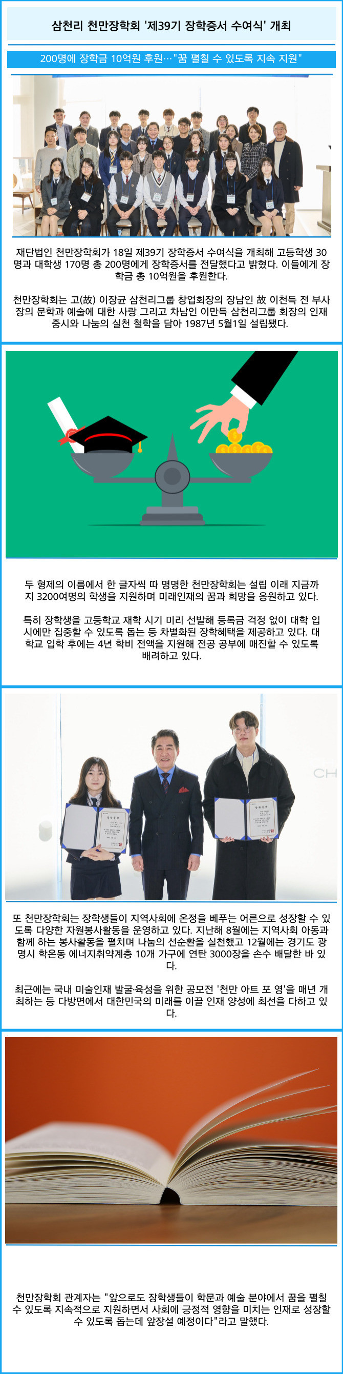 [프라임경제] 재단법인 천만장학회가 18일 제39기 장학증서 수여식을 개최해 고등학생 30명과 대학생 170명 총 200명에게 장학증서를 전달했다고 밝혔다. 이들에게 장학금 총 10억원을 후원한다.