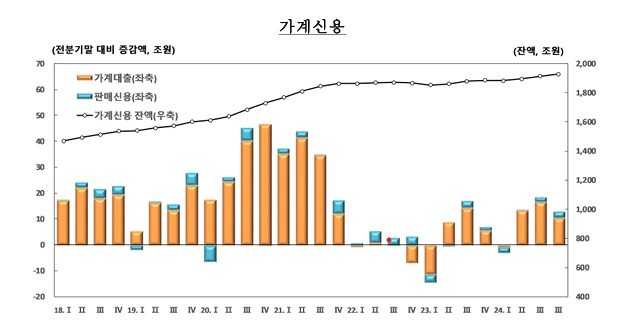 가계신용에서 가장 큰 비중을 차지하는 가계대출은 지난해 4분기 1807조원을 기록하며 전분기 대비 10조6000억원 늘었다. 분기별 가계대출은 △지난해 1분기 8000억원 감소 △2분기 13조3000억원 증가 △3분기 16억7000억원 증가한 바 있다.