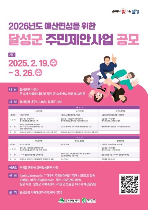 [프라임경제] 달성군(군수 최재훈)은 2026년 주민참여예산편성을 위한 2025년 주민제안사업을 2월19일부터 3월26일까지 공모한다.