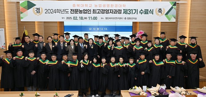 전문농업인 최고경영자과정은 농업인의 경쟁력 향상을 위해 도 농업기술원, 시군농업기술센터, 충북대학교 3개 기관이 협력해 운영하는 장기 교육과정으로, 지난해 3월부터 12월까지 32회에 걸쳐 총 45명의 농업인이 수료했다. 교육과정은 스마트첨단농업, 농식품가공창업, 친환경 재배·토양관리 3개 학과로 운영됐다.