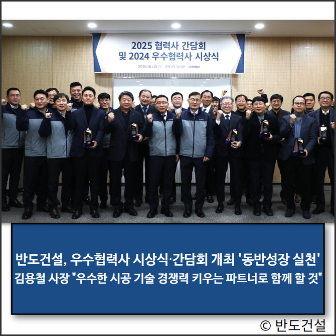 반도건설은 지난 13일 한국과학기술회관에서 지난해 시공 현장에서 함께 협력한 협력사 대표들과 함께 2025 협력사 간담회 및 2024 우수협력사 시상식을 가졌다. 이날 행사에는 김용철 반도건설 사장, 이정렬 시공부문 대표 및 임직원들과 우수협력사로 선발된 14개사 대표 및 임직원 등이 참석했다.