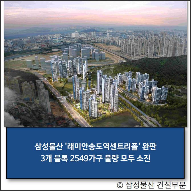 삼성물산(028260) 건설부문(이하 건설부문)이 송도역세권 도시개발사업 부지에 공급하는 '래미안 송도역 센트리폴'의 모든 블록을 완판했다. 2·3블록 완판에 이어 1블록까지 예비 당첨자 계약에서 조기 완판에 성공하면서 '래미안' 브랜드 파워를 입증했다는 평가다.