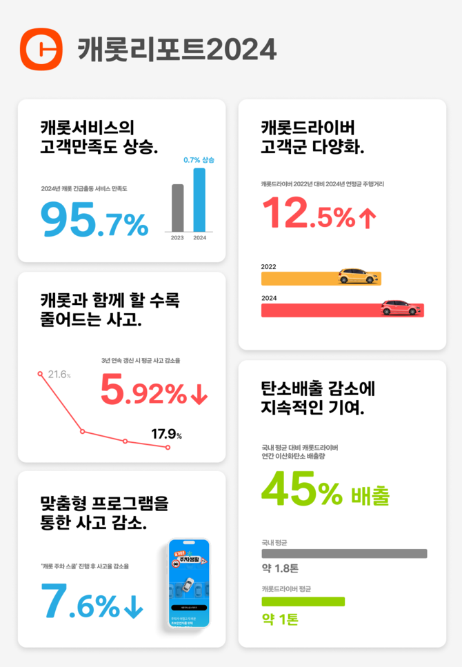 캐롯의 데이터 기반 안전 주행 프로그램도 도로 위 안전성 개선에 기여하고 있다. 보험 갱신 1회차마다 평균 사고율이 5.92% 감소했으며, 캐롯이 운영하는 '주차 스쿨' 프로그램 참여 고객의 사고율은 7.6% 줄어드는 효과를 보였다. 여기에 더해, 2024년 기준 긴급출동 서비스 고객만족도가 95.7%를 기록하며 2023년 대비 0.7% 상승하는 등 차별화된 서비스가 높은 만족도를 제공하고 있다.
