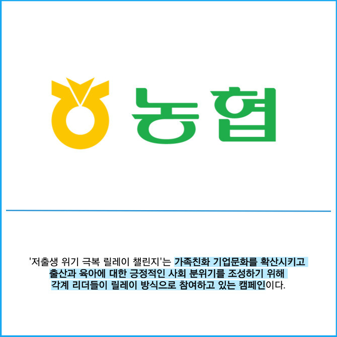 [프라임경제] NH농협은행은 저출생 위기를 극복하고, 일과 가정의 양립 문화 확산을 위한 '저출생 위기 극복 릴레이 챌린지'에 강태영 은행장이 동참했다고 19일 밝혔다.