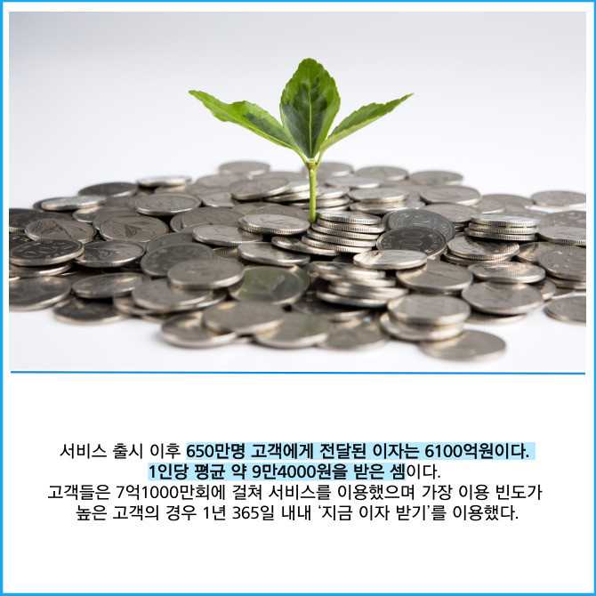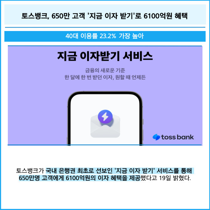 [프라임경제] 토스뱅크가 국내 은행권 최초로 선보인 '지금 이자 받기' 서비스를 통해 650만명 고객에게 6100억원의 이자 혜택을 제공했다고 19일 밝혔다.