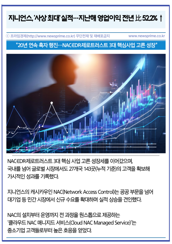 NAC·EDR·제로트러스트 3대 핵심 사업 고른 성장세를 이어갔으며, 국내를 넘어 글로벌 시장에서도 27개국 143곳(누적 기준)의 고객을 확보해 가시적인 성과를 기록했다.