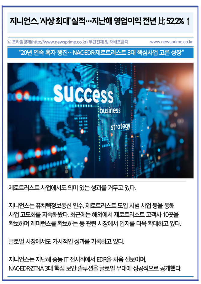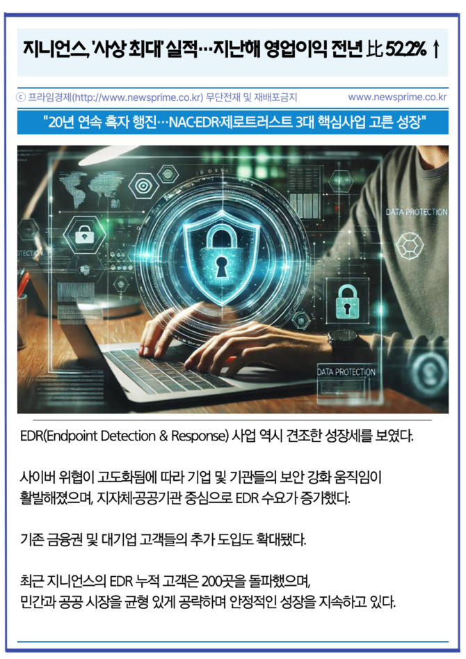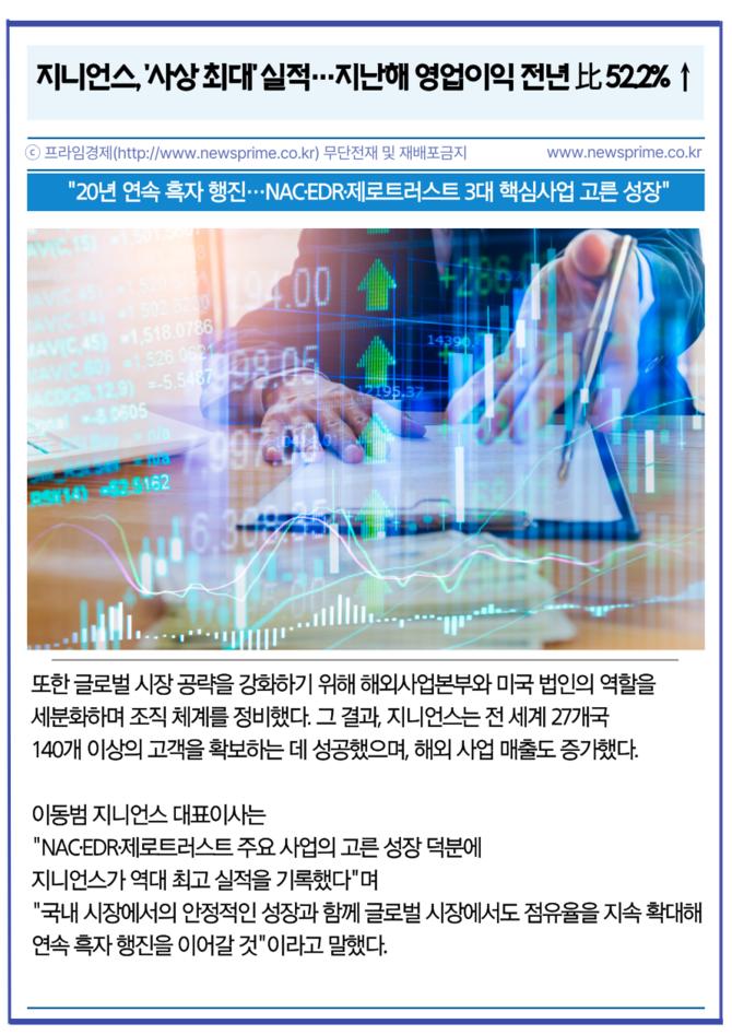 사이버 보안 전문 기업 지니언스는 2024년 연결기준 영업이익 98억원을 기록하며 전년 대비 52.2% 성장했다고 19일 공시했다. 매출액과 당기순이익 역시 각각 15.7%, 74.6% 증가한 496억원, 109억원이다