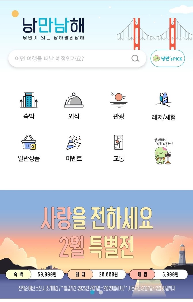 특히 3월부터는 매월 쿠폰을 발급하고 이벤트를 개최하는 등 지속적으로 다양한 혜택을 제공할 계획이다. '낭만남해'에 접속하려면 포털사이트에서 '낭만남해' 또는 '남해군'을 검색하거나 전용 APP를 다운로드하면 된다.