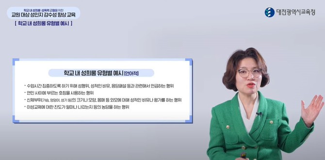 이번 교육은 대전교육공동체의 성인지 감수성 향상을 통해 성희롱·성폭력으로부터 안전한 교육환경을 조성하겠다는 의지로 시행된다.