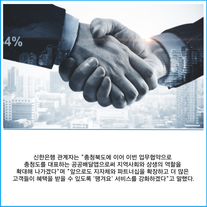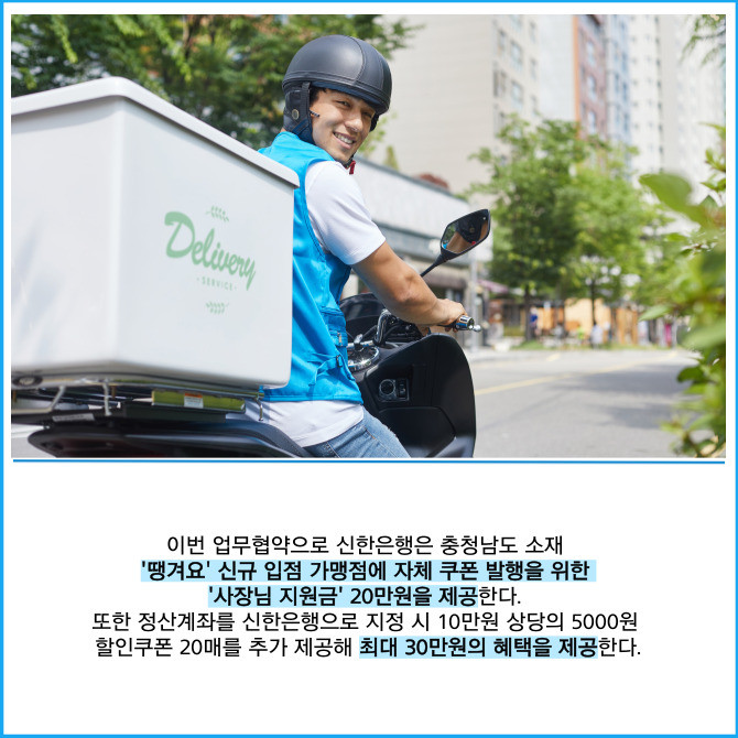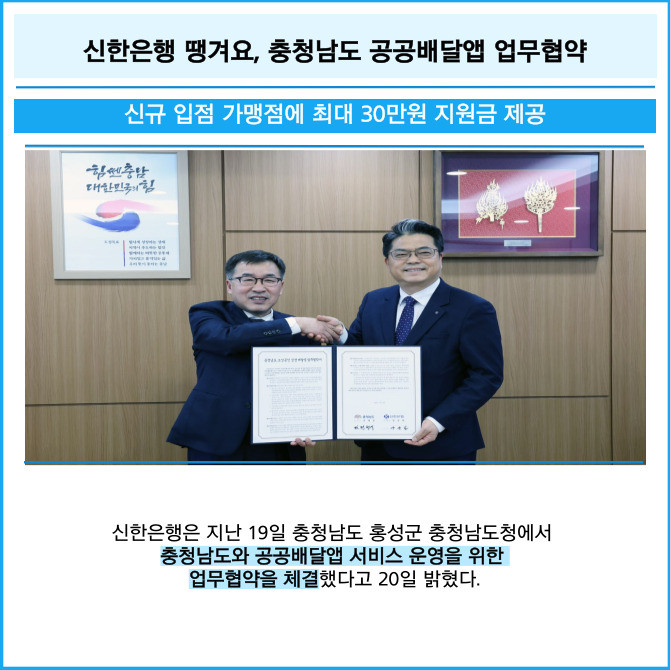 [프라임경제] 신한은행은 지난 19일 충청남도 홍성군 충청남도청에서 충청남도와 공공배달앱 서비스 운영을 위한 업무협약을 체결했다고 20일 밝혔다.