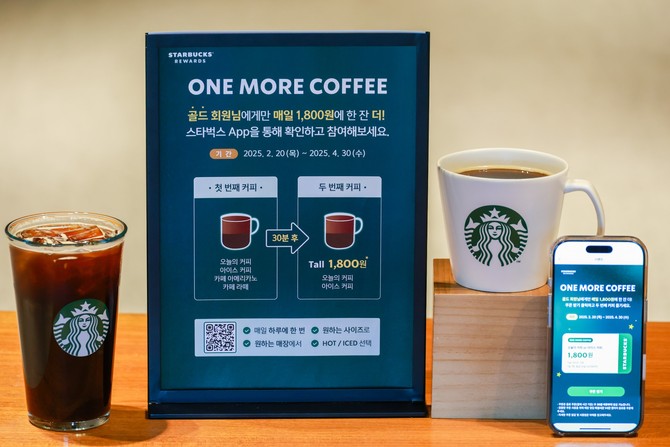 스타벅스 코리아가 4월30일까지 아메리카노 등 음료 4종을 구매하는 스타벅스 리워드 골드 회원을 대상으로 '원 모어 커피(One More Coffee)'를 시범 운영한다.