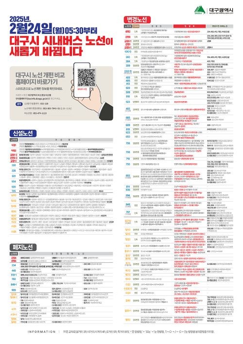 한편, 대구시는 2월24일 시행에 맞춰 △종합상황실 운영(2.19.~3.16./ 26일간) △현장안내요원 배치(2.20.~26./토·일요일제외 5일간, 500개 정류소(일500명)) △세대별 노선 안내 책자(총 112만부) 및 전단지(30만부) 배부 △노선개편 안내사이트 운영 등 대대적인 홍보와 안내 등을 통해 노선 개편 초기에 발생할 수 있는 시민 혼란과 불편을 최소화할 계획이다.