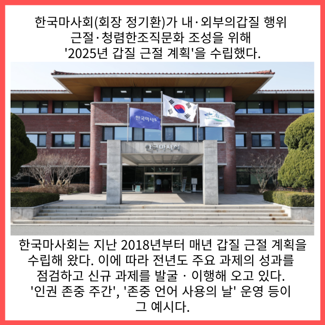 [프라임경제] 한국마사회(회장 정기환)가 내‧외부의 갑질 행위 근절·청렴한 조직문화 조성을 위해 '2025년 갑질 근절 계획'을 수립했다.