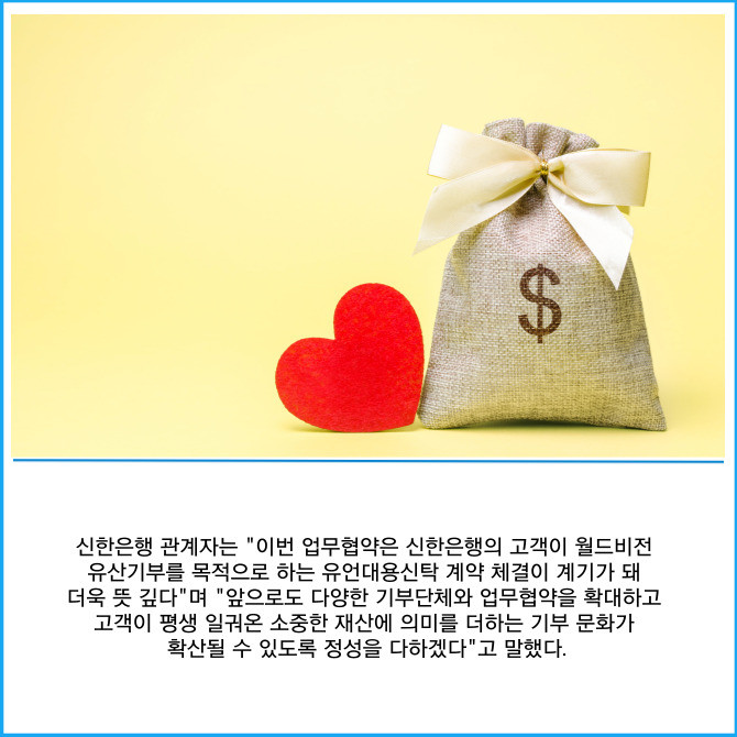 [프라임경제] 신한은행은 지난 20일 서울시 영등포구 여의도동 소재 월드비전 본부에서 국제구호개발 NGO 월드비전과 '신탁 활용 유산기부 협력'을 위한 업무협약을 체결했다고 21일 밝혔다.