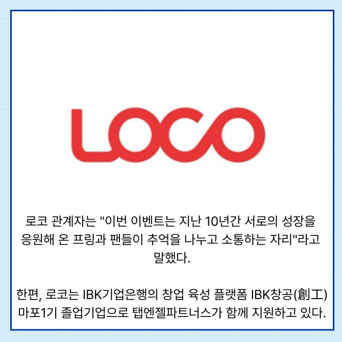 로코는 IBK기업은행(024110)의 창업 육성 플랫폼 IBK창공(創工) 마포1기 졸업기업으로 탭엔젤파트너스가 함께 지원하고 있다.