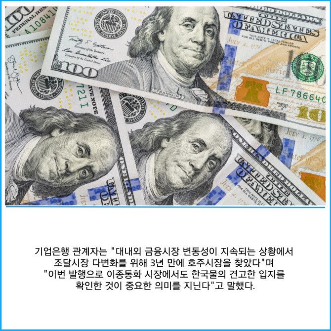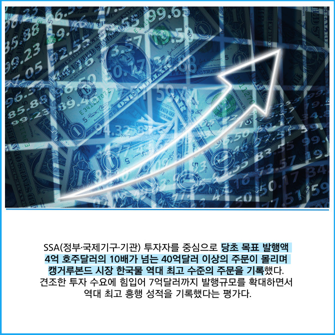 [프라임경제] IBK기업은행(024110)은 지난 20일 호주달러 7억불(미화 약 4억5000만불) 규모의 캥거루채권 발행에 성공했다고 21일 밝혔다. 캥거루채권은 호주 자본시장에서 외국기관이 호주달러로 발행하는 채권이다.