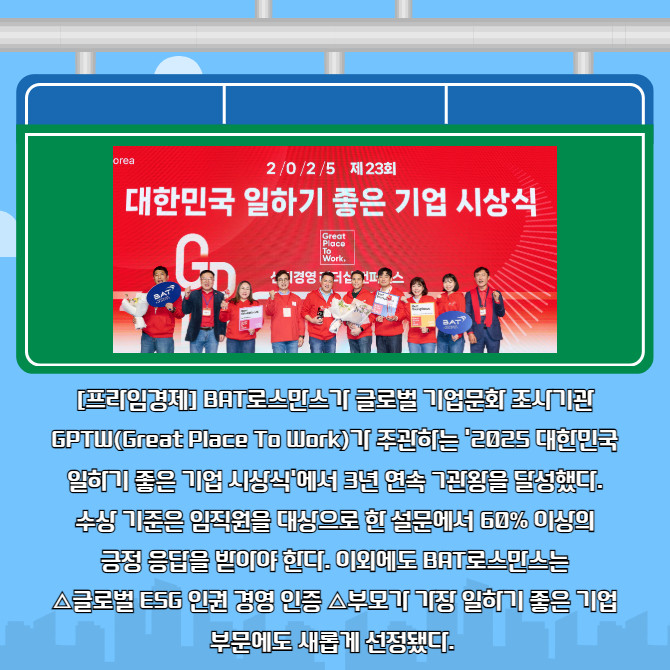 [카드] BAT로스만스, '일하기 좋은 기업' 3년 연속 7관왕