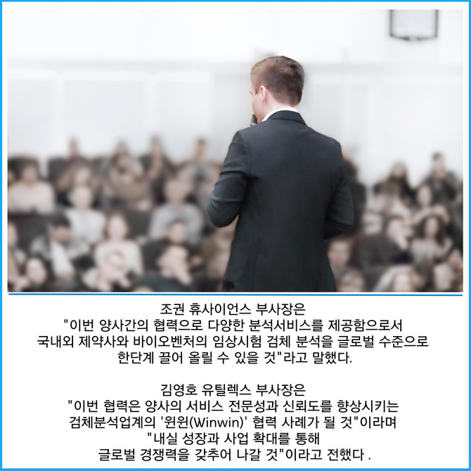 [프라임경제] 유틸렉스(263050) 자회사 포트노바와 디티앤씨(187220) 검체분석기관 휴사이언스가 임상검체분석 품질강화와 서비스 확대를 위해 협력한다고 24일 밝혔다.
