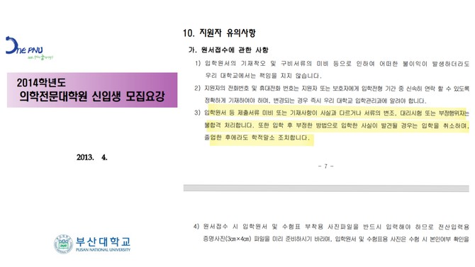 실제 '부산대 2014년도 의학전문대학원 신입생 모집 요강'에서부터 서류에 관한 부분이 공지되어 있었다.