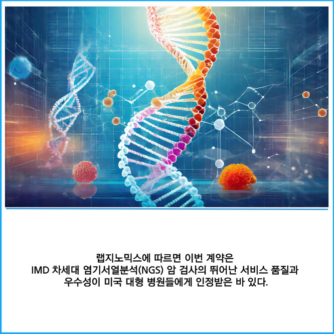 랩지노믹스에 따르면 이번 계약은 IMD 차세대 염기서열분석(NGS) 암 검사의 뛰어난 서비스 품질과 우수성이 미국 대형 병원들에게 인정받은 바 있다.