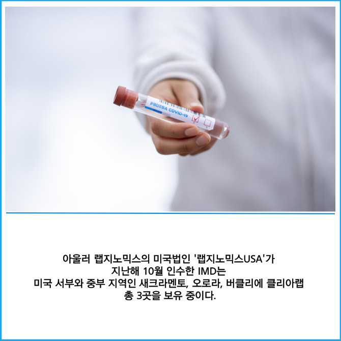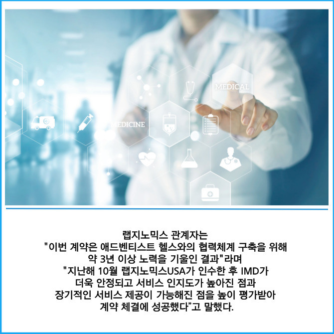 [프라임경제] 랩지노믹스(084650)는 자사 클리아랩 아이엠디(IMD)가 미국 대형 통합 의료 네트워크(IDN) 그룹인 애드벤티스트 헬스(Adventist Health)와 서비스 공급 계약을 체결했다고 24일 밝혔다.