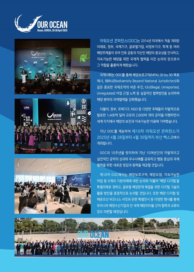 아워오션 콘퍼런스는 해양 이슈에 대한 국제 협력 방안을 논의하고, 정부, 국제기구, 글로벌 NGO 등 여러 해양 주체들이 자발적 공약을 발표하는 고위급 해양 국제회의로, 제10차 OOC는 4월28일부터 30일까지 3일간 대한민국 부산에서 개최된다.