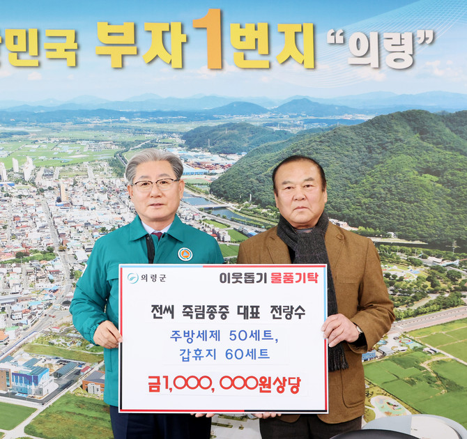 한편 아들로부터 얘기를 전해 들은 아버지 전랑수 씨도 어려운 이웃을 돕겠다며 생필품 100만원 어치를 구매해 군 사회복지과에 기탁했다. 의령군 칠곡면 화촌마을이 고향인 전랑수 씨는 현재 전씨 죽림종중 대표를 맡고 있다.
