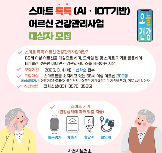 [프라임경제] 사천보건소가 3월4일부터 스마트 톡톡 어르신 건강관리사업 대상자 200명을 모집한다.